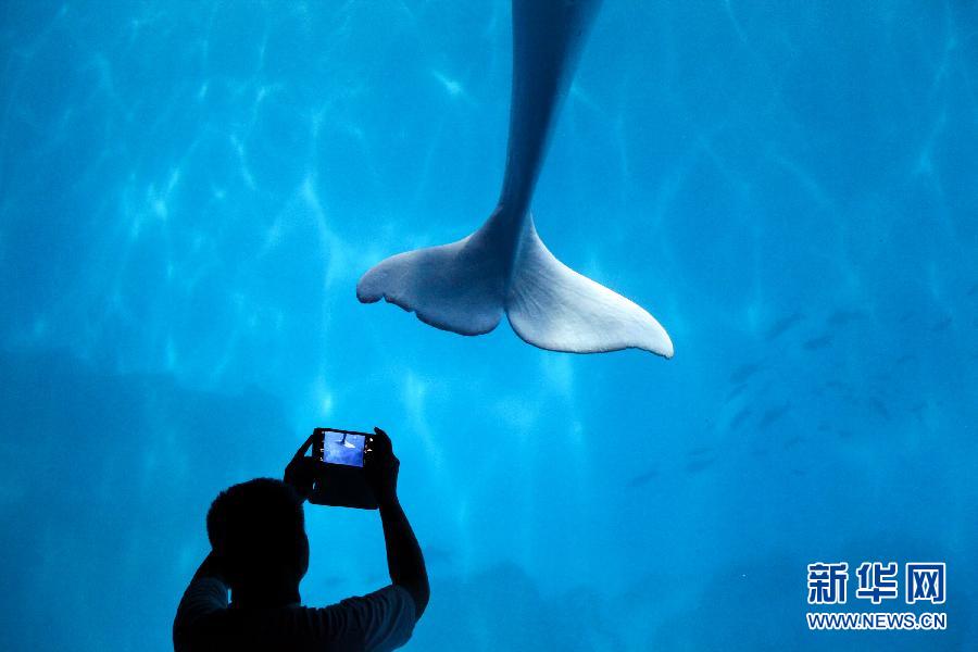 8月1日晚,一名参观者在拍摄白鲸。 8月1日,“海底苍穹·鱼我共眠”主题海洋夜活动在天津极地海洋馆举行,夜宿的参观者们同众多海底生物共度奇妙夜。 新华社发(李想 摄)
