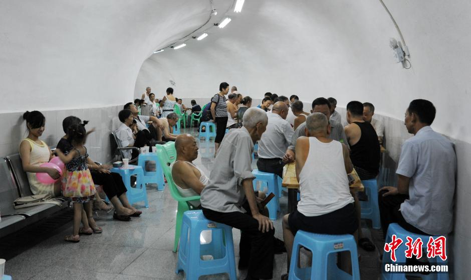 8月2日,正值三伏酷暑天气,四川达州城区气温不断升高。达州人民公园内修建于上世纪60年代的防空洞免费开放,吸引市民在此聊天、打牌、下棋、学习。曾猛 摄
