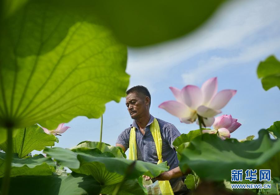 58岁的刘毛仔在江西南丰县甘竹镇坪上村的莲田里采集莲蓬(7月15日摄)。为了避开午后的高温,老刘每天凌晨5点多起床,一早开始工作。由于老刘在室外作业,所以日工资比室内制莲工高30元。 “只要地球不停止运转,就有没法歇的行业和歇不了的劳动者”。近年来随着高温天气趋于增多,保护劳动者防暑降温权益更显重要。专家表示,要重视劳动者的“清凉权”,让他们的身体健康和生命安全得到更有力的保障。新华社记者 周密 摄