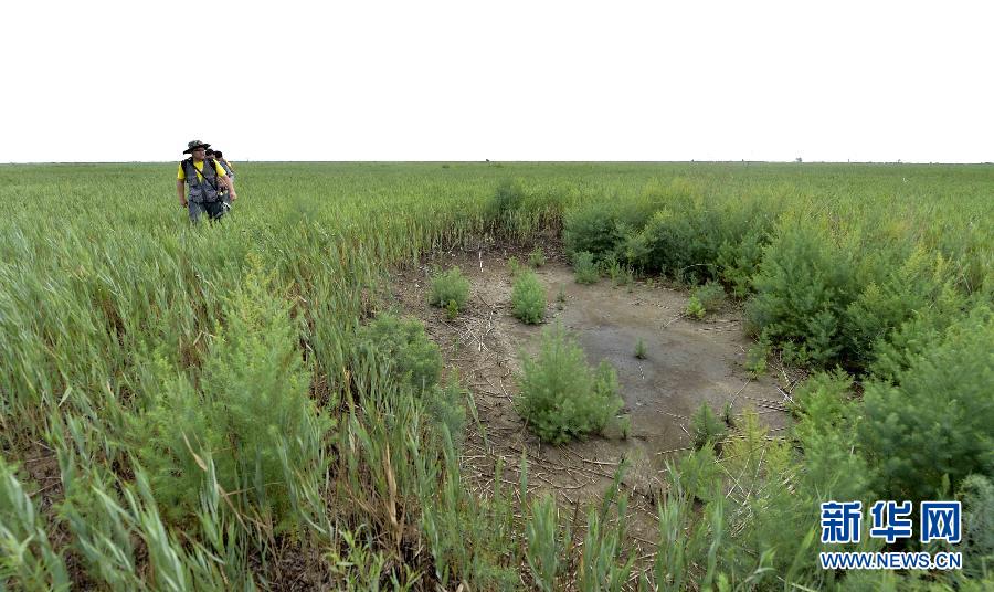 8月1日,一位媒体记者从已干涸的湿地中低洼积水处走过。近日,天津滨海新区北大港水库因入夏以来降雨量偏少,湿地水源补给不足,天气炎热,蒸发量增大,部分区域出现干旱迹象。北大港水库集水面积达150平方公里,是北大港湿地自然保护区的重要组成部分,它地形总体上是西北部高,东南部低。目前,西北部水库湿地表面大面积龟裂,河流和低洼处干涸,野生动植物减少。新华社记者 岳月伟 摄