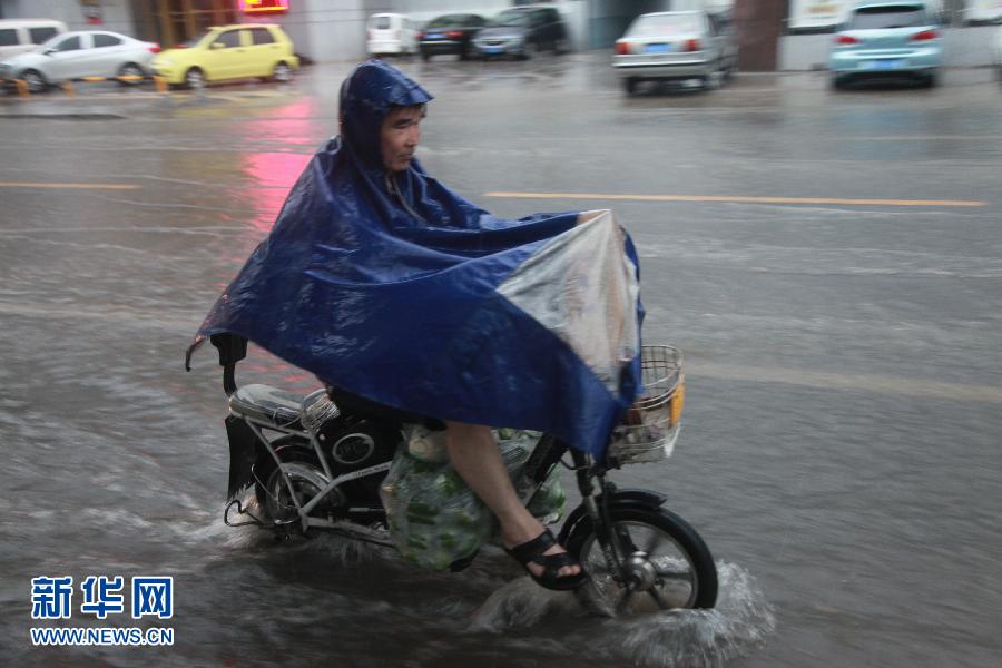 8月3日,行人在山东滨州市区积水中疾行。山东滨州市气象台将暴雨橙色预警信号升级为暴雨红色预警信号。滨州市部分地区降水量已达100毫米,预计今天白天到夜间滨州中北部大部分地区降水量将达100毫米以上。局部伴有雷暴、大风等强对流天气。新华社发(刘春迎 摄)