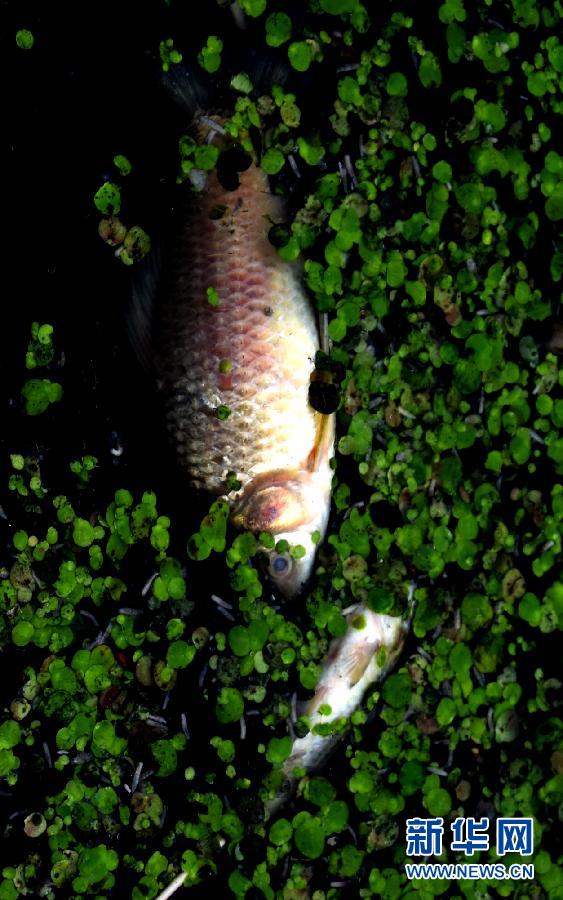 被严重污染的西流湖水面上漂浮着死鱼(7月29日摄)。进入夏季,郑州市西流湖公园和连接湖水的贾鲁河水系连续发生水体污染事件,水质变黑发臭,水面出现大量浮萍藻类,湖中的鱼群不断死亡。据河道养护工作人员介绍,水系污染的主要原因是河道上游沿线小企业的工业废水和城市生活污水超标排放,污染源头不能根治,使水质受到严重污染,水体功能损失。当地群众呼吁政府有关部门加大治理力度,改善生态环境。新华社记者 朱祥 摄