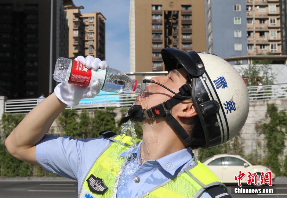 交巡警在马路边喝水解渴。 周毅 摄