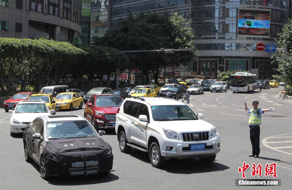 重庆临江门,一交巡警正在烈日下指挥交通。 周毅 摄