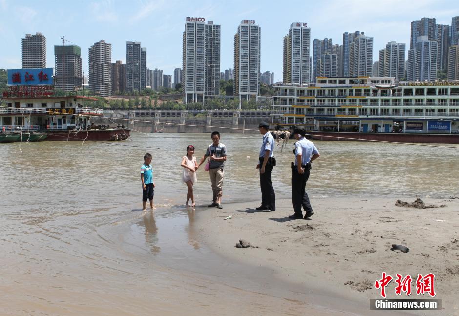 民警在重庆朝天门码头河滩上劝导市民江边玩水注意安全。 周毅 摄