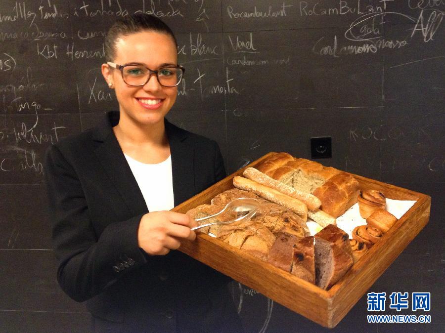 7月2日,在西班牙赫罗纳附近的罗卡三兄弟餐厅,一名女服务员展示新鲜出炉的面包。