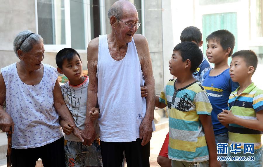 8月4日,孩子们搀扶徐俊洲夫妇出行。河北省大城县毛演马村93岁的抗战老战士徐俊洲老人在抗日战争期间分别当过机枪手和炮手,参加过数次对日作战。老人时常给晚辈回忆当初抗战时期的经历,对他们进行爱国主义传统教育。新华社记者 李晓果 摄