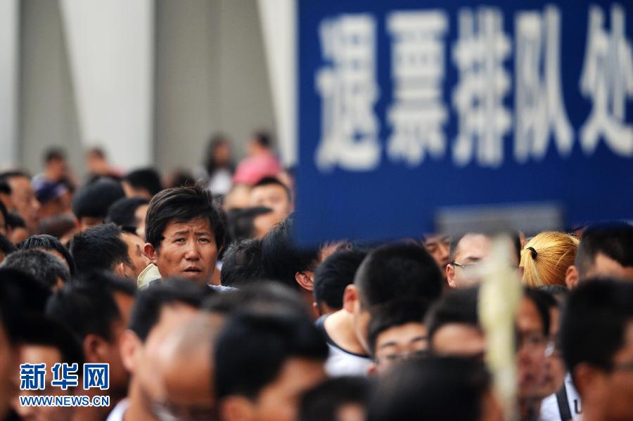 8月5日,旅客在兰州火车站广场上排队等待改签和退票。受暴雨影响,8月5日至7日,Z128、Z105、Z273等22趟经陇海铁路进出甘肃、青海、新疆、西藏等地的列车停运;兰州、天水等火车站到发站列车均出现大面积晚点。仅兰州火车站8月4日、5日两天就有超过2万名旅客现场退票或改签。兰州火车站目前已启动应急预案,通过加开退改签窗口、专人引导等方式帮助滞留旅客,同时公路客运部门也投入应急储备运力,方便旅客出行。铁路部门提醒旅客:对已公布全程停运的车次,可在互联网和窗口办理退票,退票时间延长至开车后5日内。 新华社记者 陈斌 摄