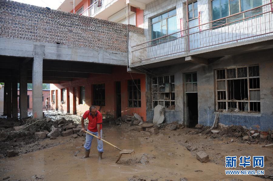 在临县安家庄乡安家庄村,村民问贵平在院里清理淤泥(8月4日摄)。