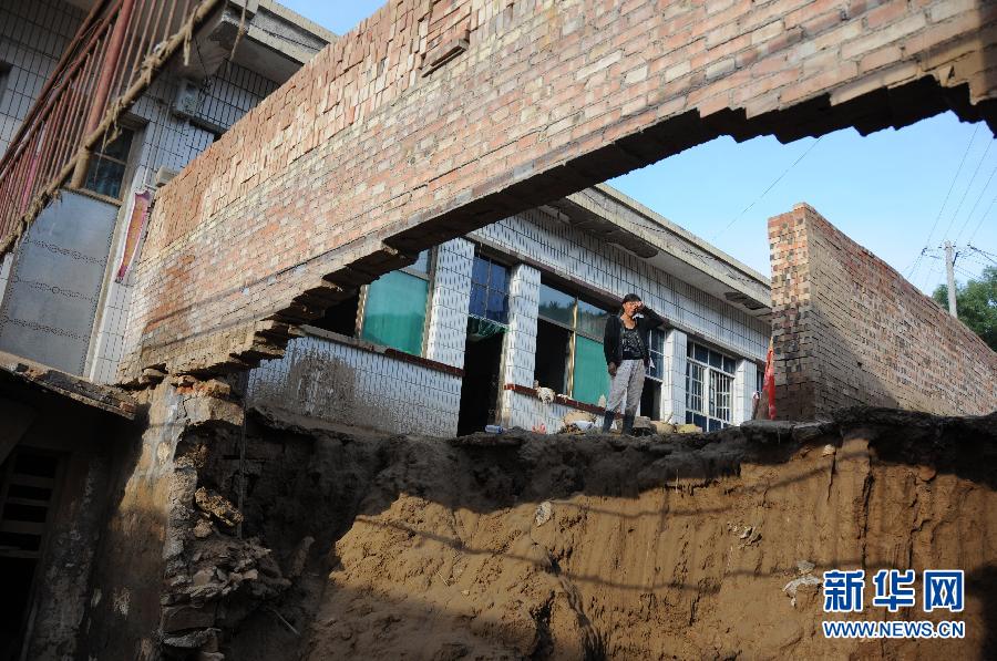 在临县安家庄乡安家庄村,村民王俊娥家的院墙被冲垮,院子地面塌陷(8月4日摄)。