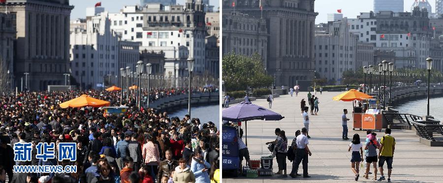 左图:2月19日,上海外滩人山人海;右图:8月5日,上海中心城区最高气温达37.6℃,外滩游客屈指可数(拼版照片)。当日,上海中心气象台发布高温橙色预警信号。截至14时30分,上海中西部地区最高气温达38℃,中心城区达37.6℃。 新华社记者 丁汀摄