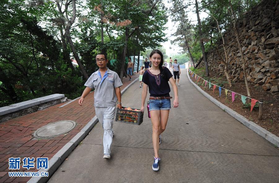 8月5日,在山东烟台动物园,美国女孩席琳和饲养员一起给动物搬运水果。今年19岁的席琳来自美国旧金山,她是加拿大温哥华哥伦比亚大学一年级学生,今年7月来到山东烟台的鲁东大学学习中文,出于对动物的喜爱,席琳与烟台动物园取得联系并成为这里的一名义工。席琳的工作是帮助饲养员喂食以及打扫笼舍,空闲时间她还会和来动物园游玩的小朋友们用英文和中文交流,完成工作的同时,还能更多地了解中国。新华社发(初阳 摄)