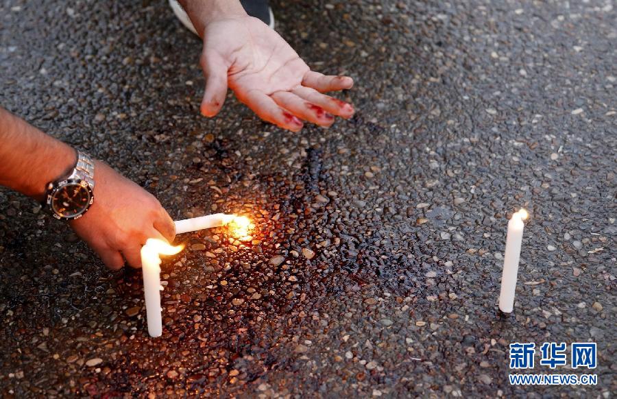 2014年3月22日,在伊拉克巴格达,伊拉克记者在“自由伊拉克”电台负责人兼记者穆罕默德·贝达维遇害地点点燃蜡烛表示哀悼。穆罕默德·贝达维当日在位于巴格达市中心的总统府附近与负责总统府保卫的库尔德安全部队士兵发生了争执,库尔德安全部队士兵开枪将其打死。新华社/路透(张帆编辑)