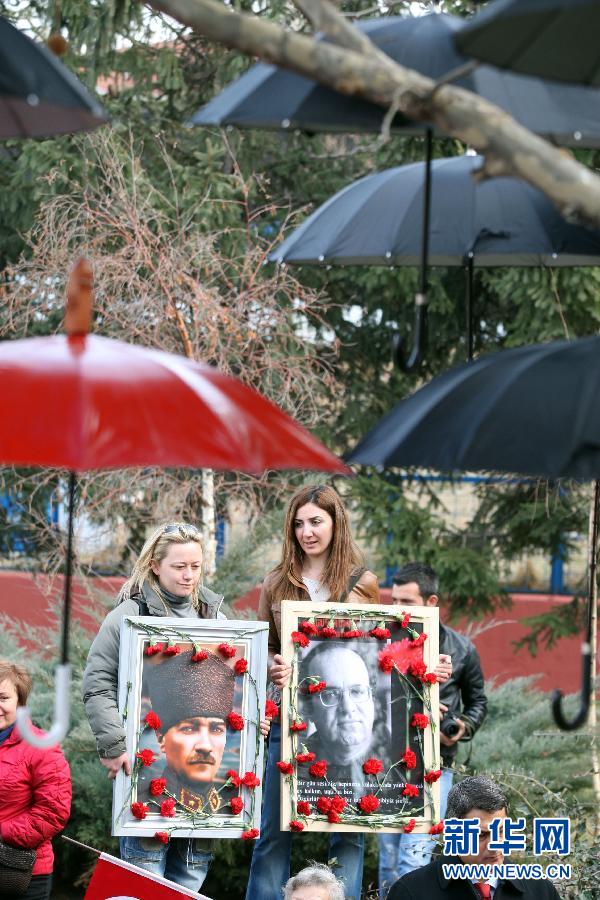 2014年1月24日,人们在位于土耳其安卡拉的姆库故居前参加悼念活动。当天是土耳其著名记者乌卡·姆库遇害21周年纪念日。姆库生前是土耳其著名记者,一直致力于调查和报道有组织犯罪和贪腐丑闻。1993年1月24日,他在家门口被汽车炸弹炸死。新华社发(穆斯塔法·卡亚摄)(张帆编辑)