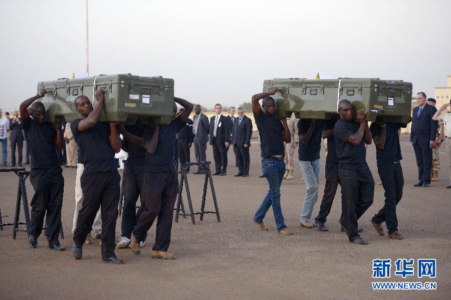 2013年11月4日,在马里首都巴马科机场,士兵抬着两名遇难法国记者的棺椁。法国国际广播电台特派记者吉斯兰·杜邦和克洛德·威尔龙2日在马里东北部的基达尔市采访时遭不明身份武装人员绑架并杀害。新华社/法新(张帆编辑)