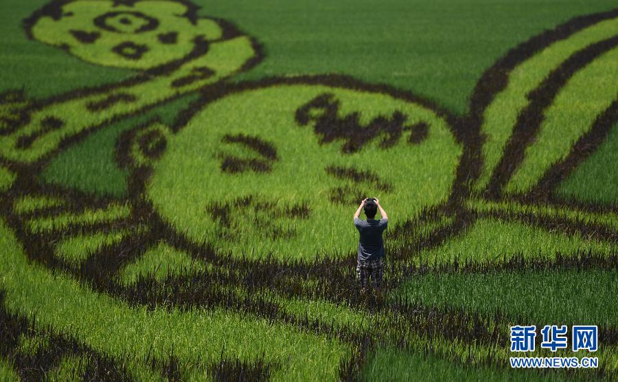 8月5日,一名男子在稻田里用手机拍摄“吉祥中国娃”稻田艺术画作。近日,湖南浏阳市古港镇梅田村一片40多亩面积的稻田里,出现了一片巨型“吉祥中国娃”画幅。这幅作品由深圳一家公司按照三维透视效果设计,由当地10多户农民按照田间标出的框架图种植上不同颜色的水稻描绘而成。当地政府还在田边设置了专门的观景区域,吸引不少游客驻足观赏。新华社记者 李尕 摄