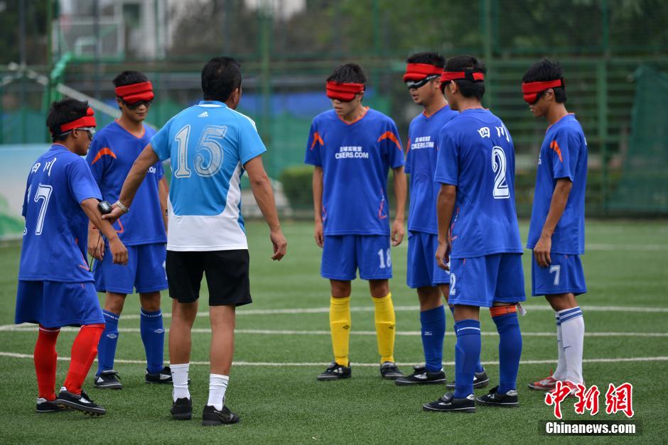 8月6日,四川盲人足球队10名球员在成都进行封闭训练,备战即将到来的全国第九届残运会。训练过程中,球员一一带上眼罩,在完全黑暗的条件下踢球。这些训练用的足球内藏有铃铛,盲人足球运动员通过声音辨别球的位置,从而进行接球、控球、传球、射门等动作。张浪 摄