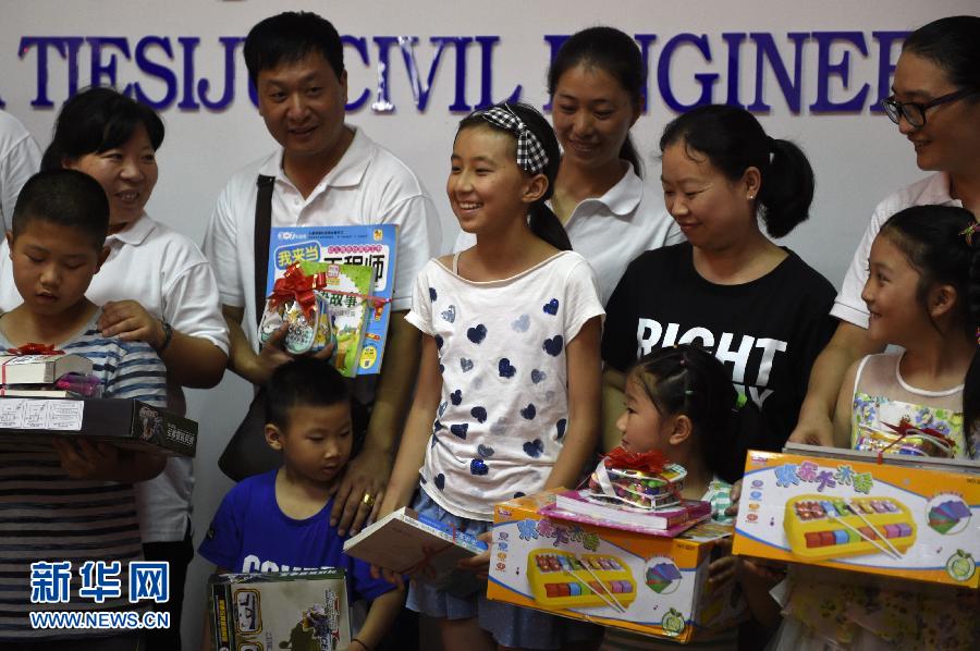 8月6日,中铁四局杭黄铁路经理部为小候鸟们送上课外读物和暑期礼物。当日,在中铁四局杭黄铁路杭州富阳建设工地,来自安徽、湖北、江苏、云南等地的30多位杭黄铁路建设者的亲属和子女参加了专门为他们组织的“小候鸟工地夏令营”。小候鸟们参观了父母工作的铁路建设工地,感受了父母在施工一线的艰辛。除此之外,他们还收到了专门为他们准备的暑期课外读物和假期礼物。新华社记者 鞠焕宗摄