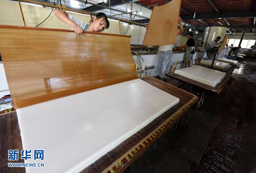 8月6日,铅山县江西含珠实业有限公司的技术工人正在抄纸。近年来,为保护、传承连四纸制作技艺,江西铅山县出台了连四纸项目保护总体规划并积极恢复古法生产连四纸。目前,连四纸年产40000刀,先后与国家图书馆、浙江省图书馆、西泠印社等多家机构达成产品专供协议,成为古籍善本修复用纸。据介绍,江西铅山连四纸又称“千年寿纸”,在宋元时就闻名遐迩。该纸以嫩竹为原料,经72道纯手工工艺历时一年制成,质地洁白绵密、耐虫防热、永不变色。2006年,连四纸制作技艺入选首批国家非物质文化遗产名录。新华社记者 宋振平 摄