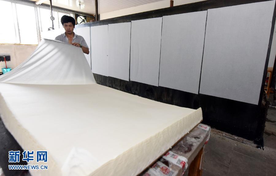 8月6日,铅山县江西含珠实业有限公司的技术工人正在焙纸。近年来,为保护、传承连四纸制作技艺,江西铅山县出台了连四纸项目保护总体规划并积极恢复古法生产连四纸。目前,连四纸年产40000刀,先后与国家图书馆、浙江省图书馆、西泠印社等多家机构达成产品专供协议,成为古籍善本修复用纸。据介绍,江西铅山连四纸又称“千年寿纸”,在宋元时就闻名遐迩。该纸以嫩竹为原料,经72道纯手工工艺历时一年制成,质地洁白绵密、耐虫防热、永不变色。2006年,连四纸制作技艺入选首批国家非物质文化遗产名录。新华社记者 宋振平 摄