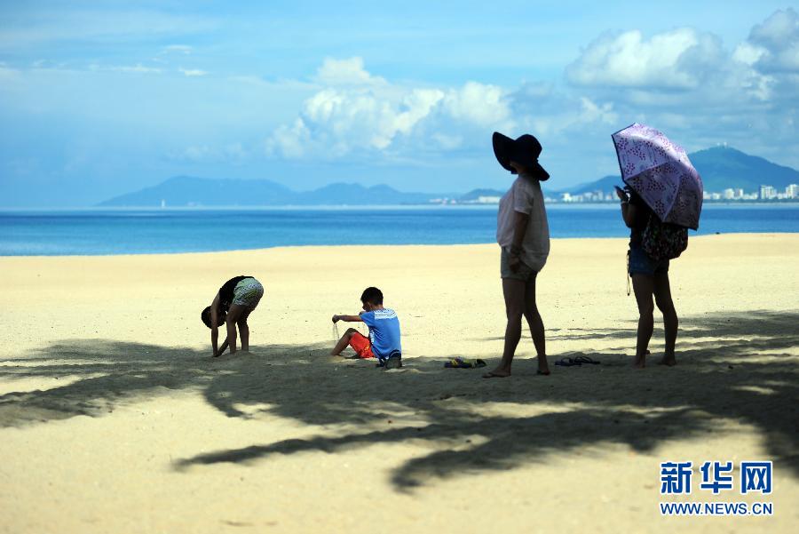 8月6日,游客在海南省三亚湾海滩椰树下游玩。炎炎烈日下,游客和市民来到海南省三亚市“椰梦长廊”海滨风景大道,在椰树下享受清凉夏日。 新华社发(沙晓峰 摄)