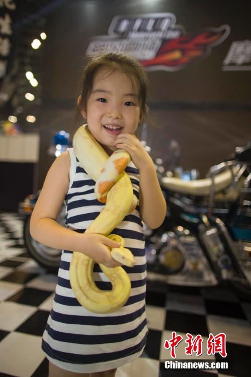 8月6日,山西太原,一名女童亲身体验黄金蟒蛇客串小车模。