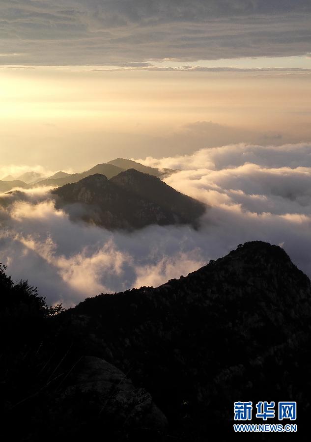 8月6日,泰山山区现双层云海奇观。当日下午,山东泰山山区出现双层云海奇观,泰山群峰顶部处于两层不同高度的云层之间,当太阳降到两层云海之间时,上下云海在阳光照射下显得波涛汹涌、奇幻多变。新华社发(柳岸埼 摄)