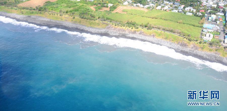 这是8月9日航拍的发现第一块MH370残骸的法属留尼汪岛东部圣安德烈海滩附近海域。图片来源:新华网