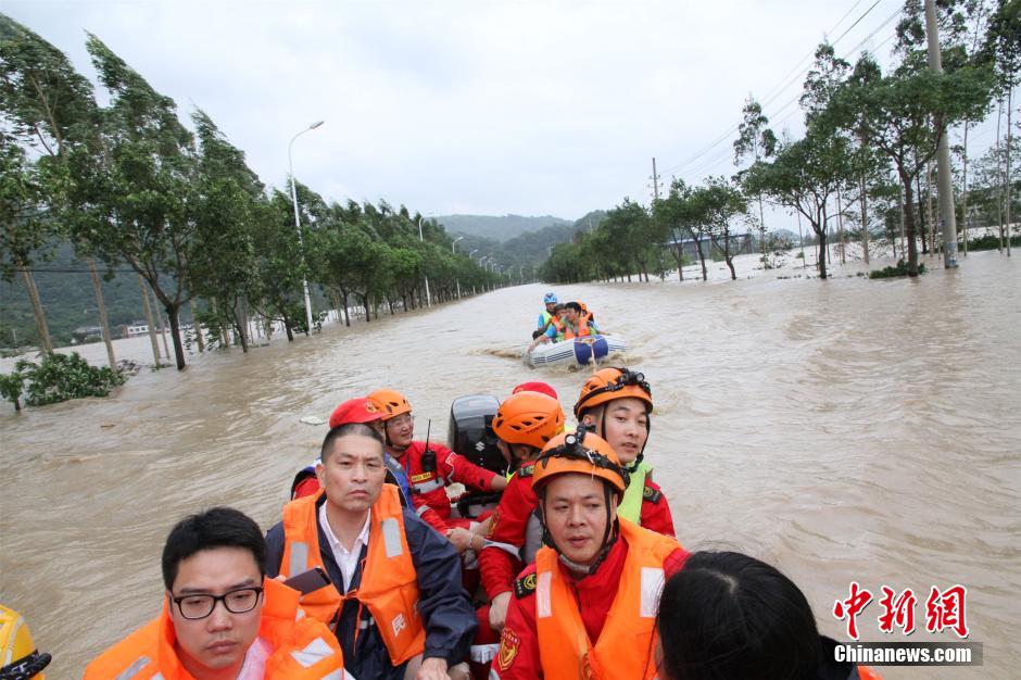 8月9日,浙江省温州市平阳县受“苏迪罗”影响,多地成“海景”。武警官兵、民间救援队积极展开救援“海”上救援。今年第13号台风“苏迪罗”虽不在温州登陆,但严重影响温州,局部地区降水量超过百年一遇标准,甚至超历史实测记录。 中新社发 张茵 摄
