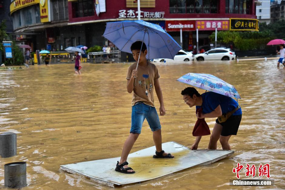 8月9日,福州在今年第13号台风“苏迪罗”影响下仍内涝严重,许多福州市民在出行时看到被淹没的福州街道,纷纷“望洋兴叹”。 李南轩 摄