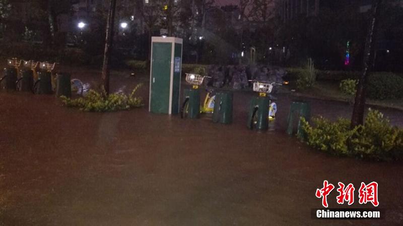 8月10日受台风“苏迪罗”影响,从9日晚间至10日,江苏全境基本持续在暴风雨中度过,苏北沿海很多地区降雨量超100毫米,城市低洼处受淹情况严重。江苏扬州、盐城在晚间相继发布暴雨红色预警信号,预计未来3小时上述地区强降水仍将持续。10日晚间,暴雨仍在冲刷着江苏盐城市区,道路上车辆和行人很少,盐城市政府旁的新都路、府西路和部分小区受淹严重。在新都路上,部分路段积水已有近1米深,市政工作人员正在用强排车排水。图为盐城的城市公共自行车被淹。 张勇峰 摄