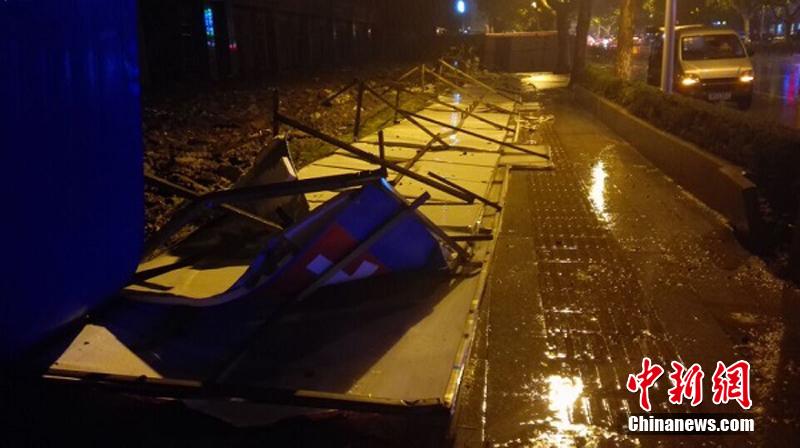 盐城气象台8月10日相继发布暴雨蓝色、黄色、橙色、红色预警信号。目前,该市东台、大丰降雨量已经超过100毫米,盐都、亭湖和建湖的部分乡镇降雨量也已达到100毫米以上,预计未来3小时上述地区强降水仍将持续。图为盐城市区大圣小区旁的一工地围挡被大风刮倒。 张勇峰 摄