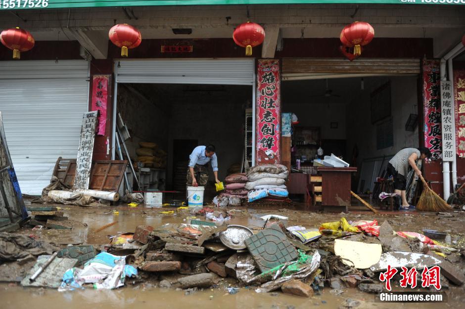8月10日,村民在清理家中的淤泥。安徽霍山县受“苏迪罗”影响,9日8时至10日5时普降大暴雨,局部特大暴雨,一小时降雨量达108.1毫米,创霍山有历史记录以来降雨量之最。 中新社发 张娅子 摄
