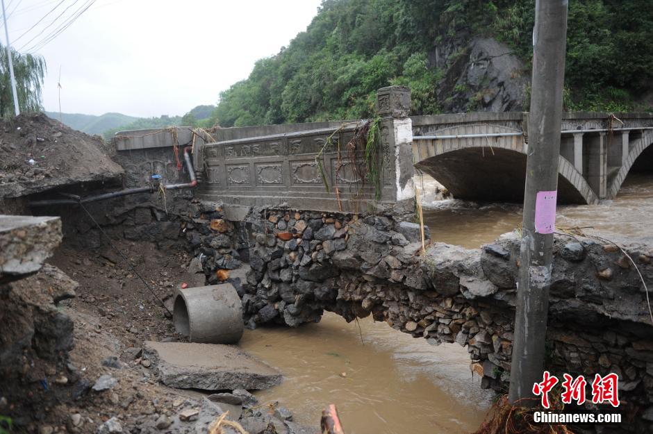 8月10日,受台风过境影响,安徽霍山县诸佛庵镇遭遇百年一遇强降雨灾害,诸佛庵镇路面被冲断。 中新社发 张娅子 摄