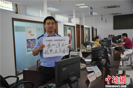 8月4日,嵊泗公安局行政审批科民警洪军正在办理出入境证件。他每日办理出入境证件20余件,老是忘了给家人添个签证。其实嵊泗本身就是旅游风景名胜区,洪军最实际的愿望就是能抽空带着自家人来个环岛游。 黄雷 摄