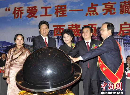 8月11日,中国国务院侨务办公室主任裘援平(右三)与西藏自治区主席洛桑江村(右四),西藏自治区常务副主席邓小刚(右二)等为“侨爱工程——点亮藏区牧民新生活”西藏项目启动仪式按动水晶球。 中新社发 李林 摄