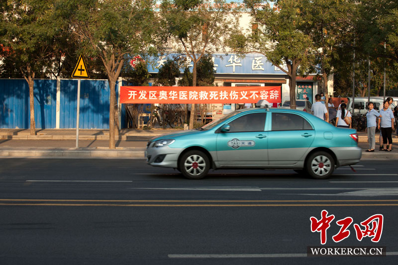 8月13日,滨海开发区附近医院打出救人标语。 中工网记者 李雪峰摄。