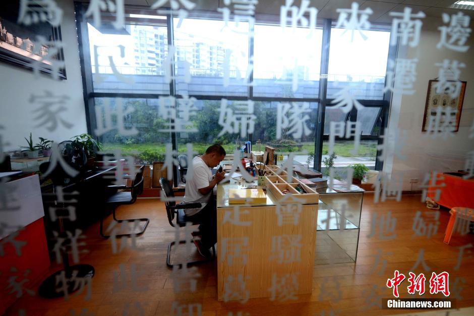宁化木活字印刷传承人邱志强在刻字。王东明 摄