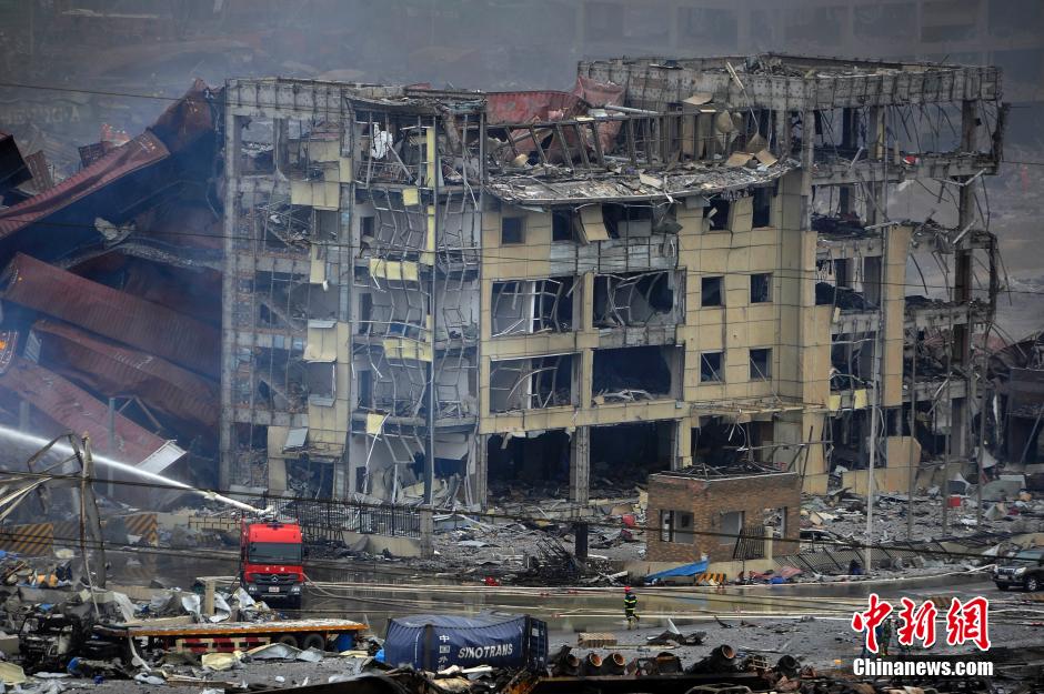 8月14日,爆炸事故现场,一辆消防车正在喷射高压泡沫,消灭残火。中新社发 佟郁 摄