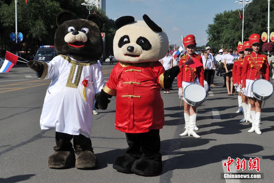 8月14日,第六届中俄文化大集在黑龙江省黑河市开幕,中俄两国民众载歌载舞巡游狂欢。 中新社发 魏来 摄