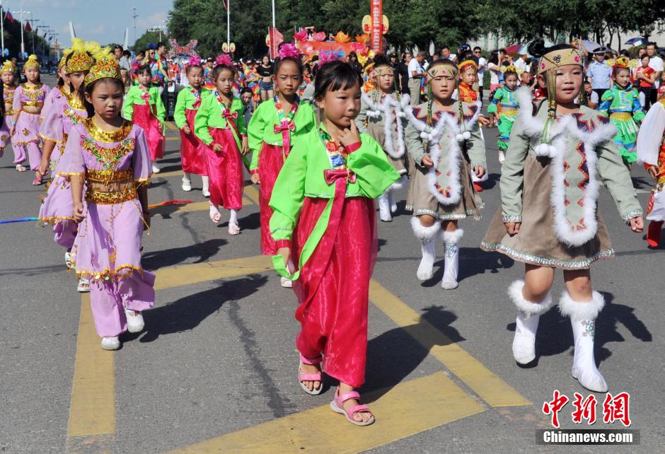 8月14日,第六届中俄文化大集在黑龙江省黑河市开幕,中俄两国民众载歌载舞巡游狂欢。  中新社发 魏来 摄