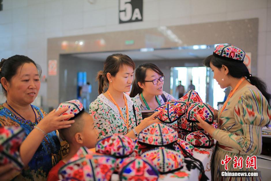 在2015中国-亚欧商品贸易博览会现场,新疆特色小花帽让游客、客商驻足围观。年磊 摄