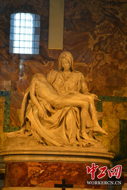 米开朗基罗24岁时雕塑作品《圣母哀痛》。圣母怀抱死去的儿子的悲痛感和对上帝意旨的顺从感在作品中刻画得淋漓尽手。这里所表现的圣母痛苦状与米开朗基罗以后的作品迥然不同。 中工网记者 秦笑语摄