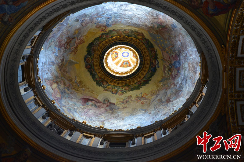 圣伯多禄大教堂内部的精美穹顶。教堂内部装饰华丽,华丽到令人惶恐不安,令人窒息。 中工网记者 秦笑语摄