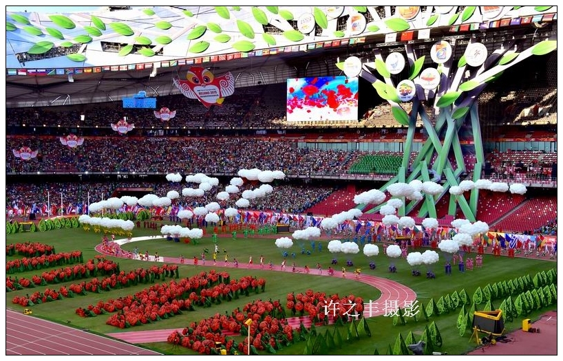 2015年8月22日下午,2015年北京国际田联世界田径锦标赛22日下午在国家体育场隆重开幕。来自207个国家和地区的近2000名运动员齐聚这里,将同场竞技、再创辉煌。当现场升起国际田联会旗、奏响国际田联会歌后,文艺演出拉开帷幕。以“从北京出发——田径让世界更美好”为主题的演出分为《梦开始》《追梦·在路上》《乘梦飞翔》三个部分。《梦开始》篇章以32名奔跑着的运动健儿,象征世界田径锦标赛走过32年历程。本届世锦赛为期9天。中国体育代表团由32名男运动员和38名女运动员组成,将参加全部47个项目中的34项比赛。工人日报-中工网记者许之丰摄影报道