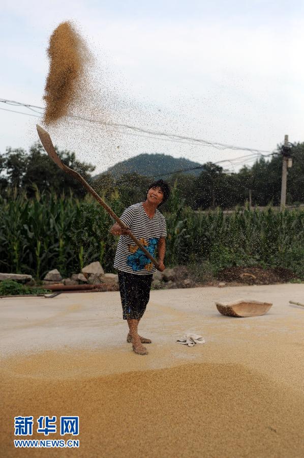 8月24日,一位村民在河南省辉县市平岭村扬晒刚刚收割的谷子。近日,河南省辉县市的谷子陆续进入成熟期,村民们纷纷开镰收割,确保颗粒归仓。辉县市地处太行山区,山坡地富含腐殖质,昼夜温差大,适宜谷子生长。新华社发(冯大鹏 摄)