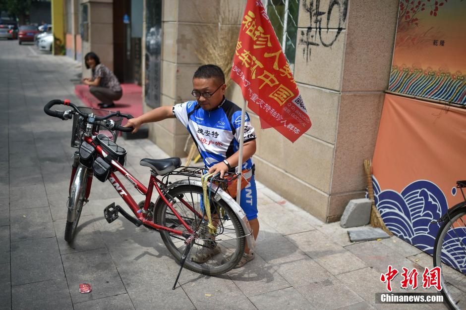 离开张家口,李卿将继续向东北地区骑行,最后折返向南,直到中国的最南边。过去几个月,李卿几乎每天风餐露宿,吃最简单的食物,住自己搭的帐篷。沿途中,他遇到了不少好心人,甚至有人把家里钥匙交给他,让他随时到家里的一间屋里住。李卿感叹,好心人给他的感动,是他继续走下去的动力。图为为了更方便骑行,他对自己的“坐骑”进行过多次改进。 中新网记者 金硕 摄