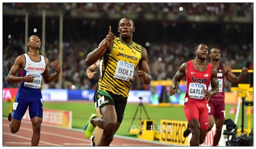 2015年8月27日晚,在北京田径世锦赛200米的决赛中,牙买加选手博尔特以19秒55的成绩获得冠军,拿下个人历史第十块世锦赛金牌,并实现200米四连冠,宣告了博尔特在他的专项200米跑道上仍是强者。美国选手加特林以19秒74获得亚军,南非选手约博德瓦纳以19秒87的成绩获得第三名。图为博尔特在200米的比赛中。中工网记者工人日报-许之丰摄影报道
