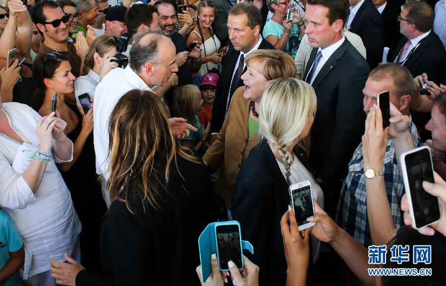8月30日,在德国柏林总理府,总理默克尔(中)参加政府开放日活动。德国“政府开放日”活动30日进入第二天,德国总理默克尔在总理府和民众见面。作为德国政府的一项传统活动,自1999年以来,联邦政府各部门在每年夏天都会选择一个周末集体对外开放,向公众展示工作内容,解答疑问。新华社记者张帆摄