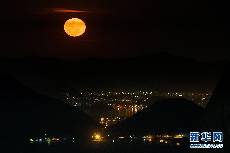 8月30日,在巴西里约热内卢,一轮圆月从瓜纳巴拉湾上升起。新华社记者徐子鉴摄